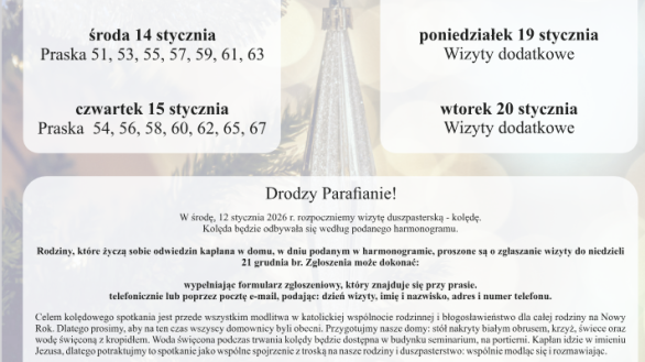 7. Ks. Janusz przy współpracy z biurem podróży Misja Travel zamierza w czasie ferii zimowych zorganizować 3 dniowy wyjazd do Wilna. Dokładny plan jest dostępny w gablotce przed kościołem (kaplicą) oraz z tyłu kościoła (kaplicy) są dostępne luźne kartki z planem. Gdyby ktoś miał taki zamiar, to prosimy, aby do miesiąca czasu, zasygnalizować wyjazd ks. proboszczowi.